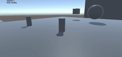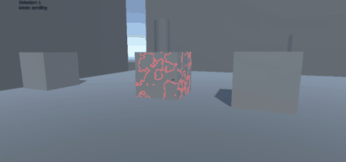 This is much nicer than before as it just adds the shader I made on top of any existing materials an object has. This means that it can be reused for any object that can be selected in this way. As there is also the wall connection to consider something different had to be done here. I tried a few different methods but the one that was the most consistent was to create a small sphere when the player clicks on an unmovable object and give that sphere the lighting effect. The shader is transparent so it looks like a ball of energy has appeared at a point the player clicks.